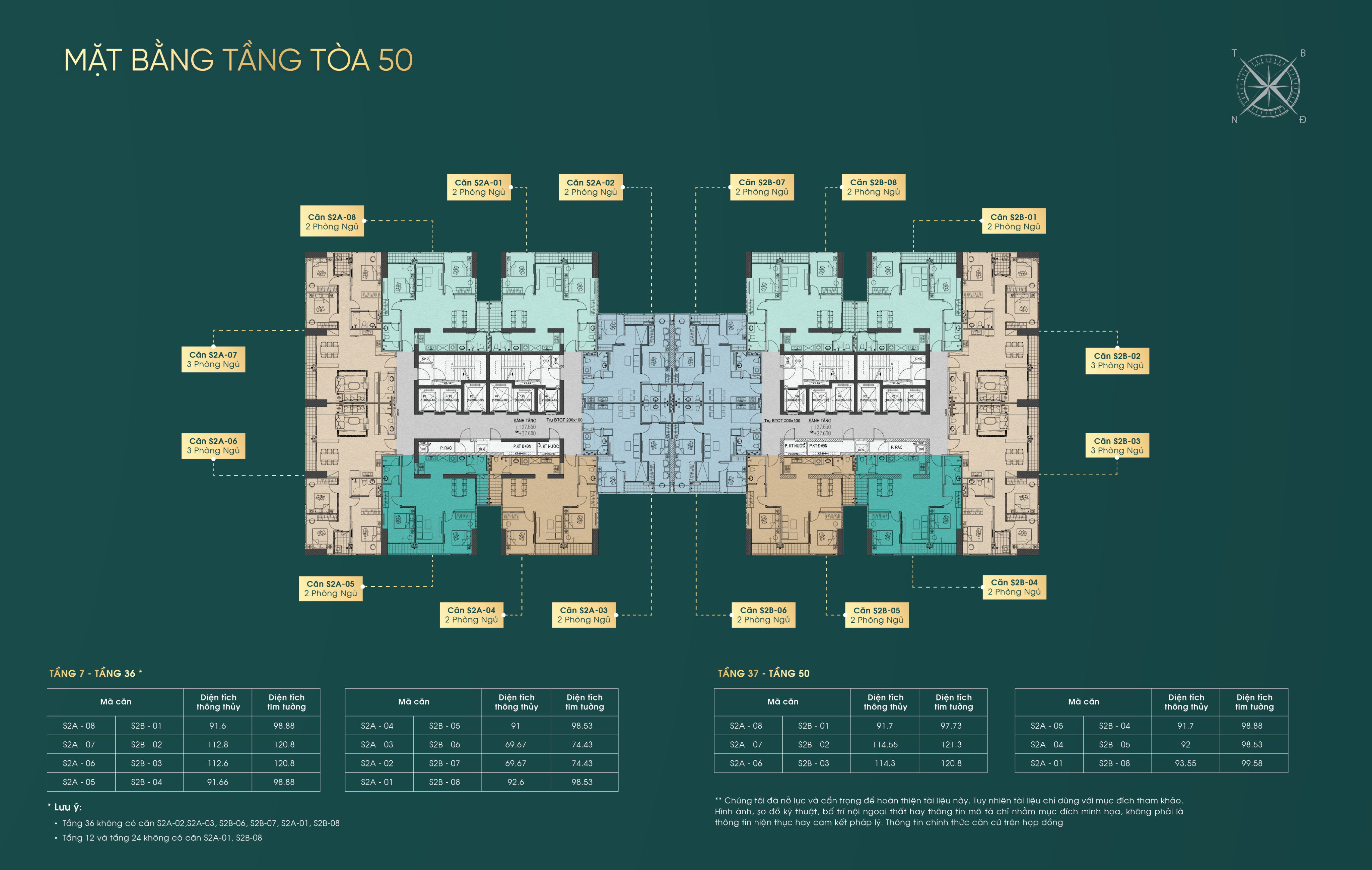 – Căn hộ 3 PN: Từ 112.8m2 – 114.55 m2 - Diện tích căn hộ 50 tầng: